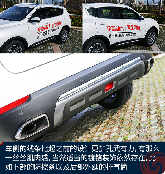 開眼角的設(shè)計(jì)雖然已經(jīng)有一陣子了,但是哈弗H6也是剛剛用上,而且頭燈的設(shè)計(jì)很簡(jiǎn)潔,但是與六邊形的前進(jìn)氣格柵搭配的感覺剛剛好,在視覺上帶來了十分不錯(cuò)的沖擊力。車側(cè)的線條比起之前的設(shè)計(jì)更加孔武有力,有那么一絲絲肌肉感,當(dāng)然適當(dāng)?shù)腻冦t裝飾依然存在,比如下部的防擦條以及后部外延的排氣筒。最值得一說的還是輪轂,全新設(shè)計(jì)的多幅19寸輪圈十分動(dòng)感,應(yīng)該屬于人見人愛的那種,而且細(xì)節(jié)上的做工也值得肯定。