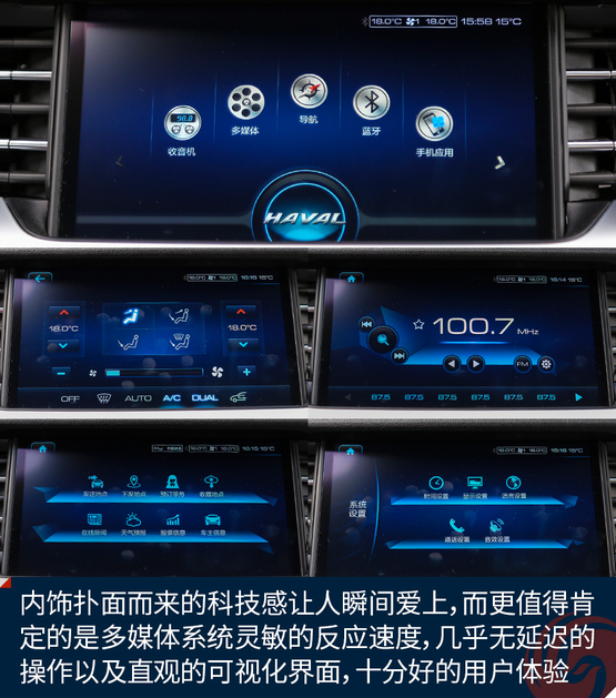 如果說外觀給了你第一重驚喜,那么內(nèi)飾的設(shè)計(jì)一定超乎了你對(duì)自主品牌的認(rèn)知,至少我認(rèn)為,全新哈弗H6上的這套內(nèi)飾,在設(shè)計(jì)上已經(jīng)超越了很多合資品牌。撲面而來的科技感讓人瞬間愛上,而更值得肯定的是這套多媒體系統(tǒng)靈敏的反應(yīng)速度,幾乎無延遲的操作以及直觀的可視化界面,都帶來十分好的用戶體驗(yàn)。