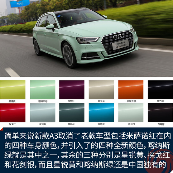 先來(lái)說(shuō)說(shuō)喀納斯綠到底是什么顏色吧。簡(jiǎn)單來(lái)說(shuō)新款A(yù)3取消了老款車(chē)型包括米薩諾紅在內(nèi)的四種車(chē)身顏色,并引入了的四種全新顏色,喀納斯綠就是其中之一,其余的三種分別是星銳黃、探戈紅和花劍銀,而且星銳黃和喀納斯綠還是兩種中國(guó)市場(chǎng)獨(dú)有的顏色。如果說(shuō)這個(gè)顏色看上去像什么,我覺(jué)得大概像是哈密瓜冰激凌,或者是綠色的奶油,反正給我一種清新又甜蜜的錯(cuò)覺(jué)。