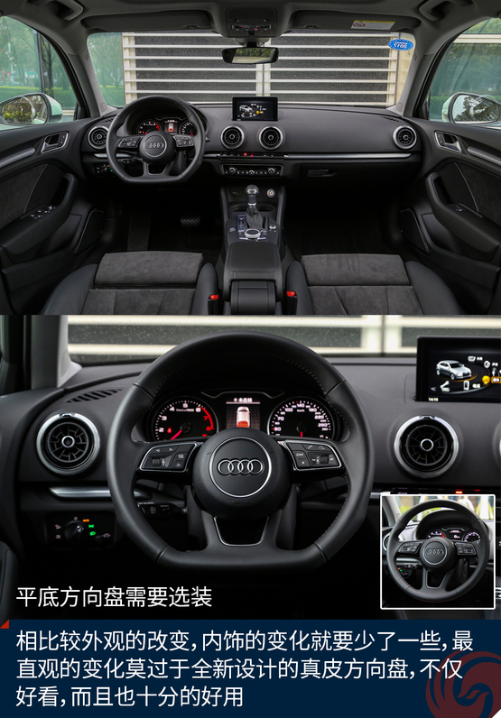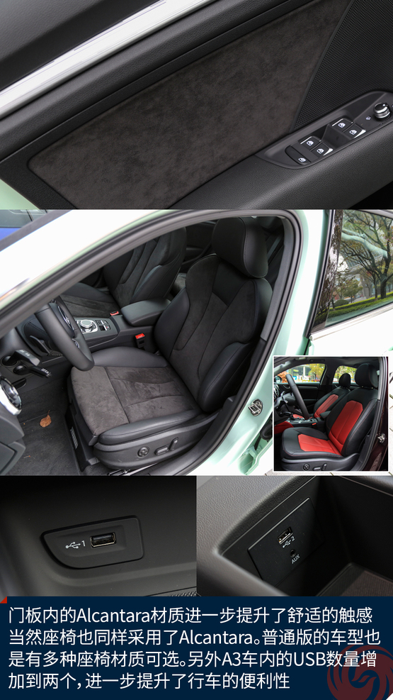 相比較外觀的改變,內(nèi)飾的變化就要少了一些,最直觀的變化莫過(guò)于全新設(shè)計(jì)的真皮方向盤(pán),不僅好看也十分的好用,發(fā)光的迎賓踏板進(jìn)一步增加了車(chē)輛的高級(jí)感,中控面板上的鋁合金材質(zhì)的裝飾條質(zhì)感出色,不僅如此,還有多種樣式和材質(zhì)可選;而門(mén)板內(nèi)的Alcantara材質(zhì)進(jìn)一步提升了舒適的觸感,當(dāng)然座椅也同樣采用了Alcantara。另外新增加的USB接口也進(jìn)一步增加了行車(chē)的便利性,這也讓A3車(chē)內(nèi)的USB數(shù)量增加到兩個(gè)。同時(shí),全新設(shè)計(jì)的MMI系統(tǒng)操作起來(lái)也更加便利,邏輯也更加清晰,并且與7英寸液晶顯示屏均成為標(biāo)準(zhǔn)配置,微微朝向駕駛員的設(shè)計(jì)也更加合理,同時(shí)還支持CarPlay。