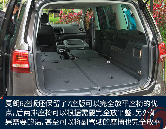 同時(shí),夏朗6座版還保留了7座版可以完全放平座椅的優(yōu)點(diǎn),后兩排座椅可以根據(jù)需要完全放平整,只不過(guò)6座版在第二排中間會(huì)有個(gè)洞,不像7座版那么完美。另外如果需要的話,甚至可以將副駕駛的座椅也完全放平,將夏朗變成一款“商用車”。