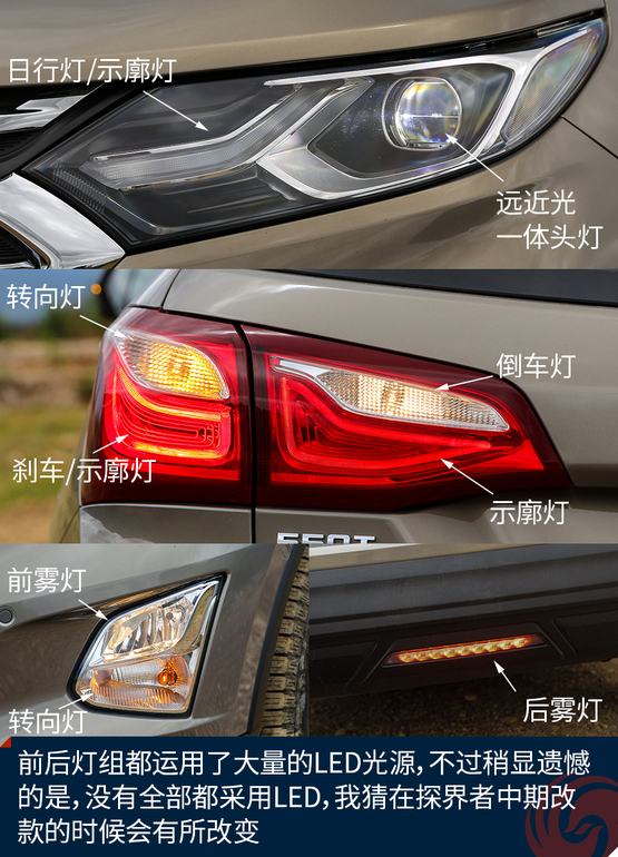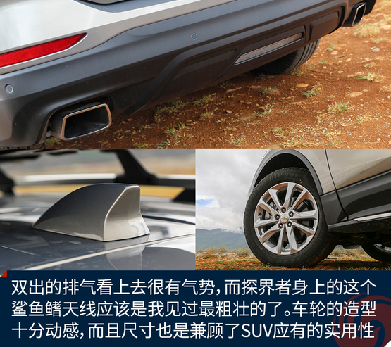 外觀上令我印象深刻的地方有這么幾個,首先前后燈組都運用了大量的LED光源,不過稍顯遺憾的是,沒有全部都采用LED,我猜在探界者中期改款的時候會有所改變。四個車門下部包邊的設計能夠減少下車弄臟褲腿時的尷尬。車頂?shù)男欣罴苷娴目捎茫覔?jù)說早期購買探界者的朋友還能獲得車頂?shù)男欣钕?,十分實用。雙出的排氣看上去很有氣勢,而探界者身上的這個鯊魚鰭天線應該是我見過最粗壯的了。車輪的造型十分動感,而且尺寸也是兼顧了SUV應有的實用性。