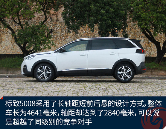 和市面上的一些7座SUV不同,標(biāo)致5008采用了長軸距短前后懸的設(shè)計方式,這樣的設(shè)計更多的出現(xiàn)在運(yùn)動派車型上。標(biāo)致5008的整體車長為4641毫米,軸距卻達(dá)到了2840毫米,可以說是超越了同級別的競爭對手。