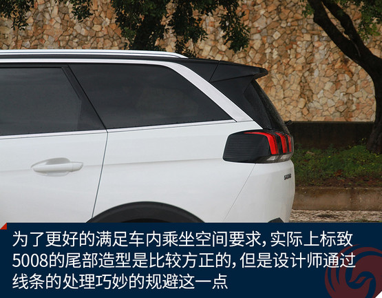 為了更好的滿足車內(nèi)乘坐空間要求,實際上標(biāo)致5008的尾部造型是比較方正的,但是設(shè)計師通過線條的處理巧妙的規(guī)避這一點。側(cè)窗鍍鉻裝飾在尾部快速下滑與尾燈相連接,上面后窗的部分則用黑色處理,使得標(biāo)致5008的視覺效果仍然充滿動感,同時還保留了第三排空間的實用性。