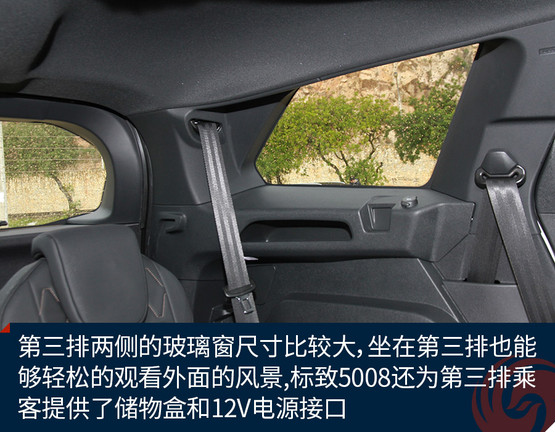 不過第三排也有值得表揚(yáng)的地方,首先正如前面所說,由于車身設(shè)計的比較方正,所以第三排的頭部空間比較理想,并不覺得特別頂頭;另外,第三排兩側(cè)的玻璃窗尺寸比較大,坐在第三排也能夠輕松的觀看外面的風(fēng)景;最后,標(biāo)致5008還為第三排乘客提供了儲物盒和12V電源接口,能夠滿足基本的使用需求。