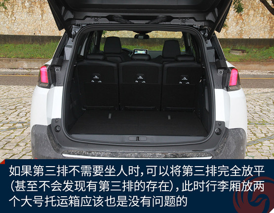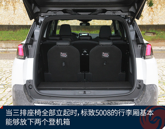 標(biāo)致5008提供了三排座椅還有另外一個顯著的好處是,可以豐富行李廂的使用方式。通過實際體驗可以發(fā)現(xiàn),當(dāng)三排座椅全部立起時,標(biāo)致5008的行李廂基本能夠放下兩個登機(jī)箱,但如果第三排不需要坐人時,可以將第三排完全放平(甚至不會發(fā)現(xiàn)有第三排的存在),此時行李廂放兩個大號托運(yùn)箱應(yīng)該也是沒有問題的。
