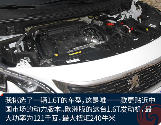 所以我挑選了一輛1.6T的車型,這是唯一一款更貼近中國市場的動力版本。歐洲版的這臺1.6T發(fā)動機(jī),最大功率為121千瓦,最大扭矩240牛米,大概相當(dāng)于國內(nèi)標(biāo)致4008 1.6T的350THP版本。