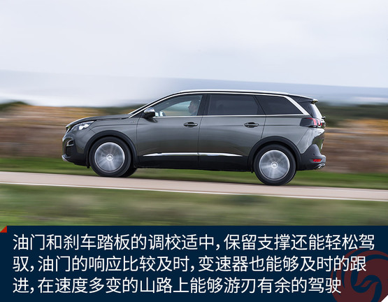 油門和剎車踏板的調(diào)校也如是,踏板腳感適中,保留支撐還能輕松駕馭,并不像多數(shù)歐系車那樣沉重。油門的響應(yīng)比較及時,變速器也能夠及時的跟進(jìn),在速度多變的山路上能夠游刃有余的駕駛。唯一的問題是低功率的1.6T在動力上沒有突出的表現(xiàn),尤其在上坡時,加速會稍感吃力,但是想到這事一款家用SUV,這也就不是問題了。而且標(biāo)致5008在國內(nèi)的主力車型將會是1.8T版本,動力還會再上一個臺階。