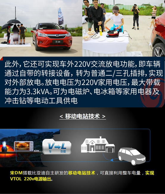 ????????宋DM可實現車外220V交流放電功能(VTOL),即車輛可通過自帶的轉接設備, 轉為普通二/三孔插排,實現對外部用電器放電。放電電壓為220V家用電壓,最大帶載能力為3.3kVA,給日常家用電器供電一點沒問題。