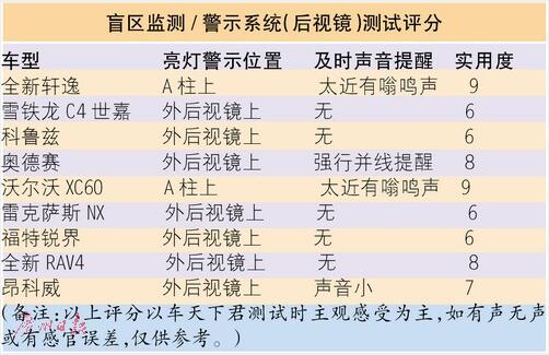 在測試當(dāng)中,車天下君留意到,不同品牌設(shè)定的盲區(qū)警示“激活”車速的要求不盡相同。在被譽為“安全之車”的沃爾沃XC60上,車天下君再度體驗了一把“低速”(低于30km/h)也有盲區(qū)警示的好感,甚至于在車天下君要在盲區(qū)有車的情況下仍要并線,或者與側(cè)向車輛距離太近,沃爾沃XC60都會發(fā)出蜂鳴聲,并在中控臺的抬頭系統(tǒng)中,發(fā)出紅色警示。而且,沃爾沃XC60最讓車天下君倍感好感的是,盲區(qū)紅色警示燈設(shè)置在兩邊的車內(nèi)A柱內(nèi)側(cè)上,駕駛員不需要費勁,紅色警示燈就在視野范圍內(nèi)清晰看見。類似這樣將紅色警示燈放在A柱上的,還有全新軒逸,在這樣一款10萬元的車子上,搭載了BSW變道盲區(qū)預(yù)警系統(tǒng)很讓人驚喜,要知道如福特、科魯茲等都是高配車型才會有。而且,軒逸這套系統(tǒng)的提示可謂“無處不在”,一經(jīng)發(fā)現(xiàn)車輛進入盲區(qū),BSW變道盲區(qū)預(yù)警系統(tǒng)就開始工作,通過儀表盤的TFT顯示屏、提示燈、提示音進行預(yù)警,能有效降低變道盲區(qū)碰撞風(fēng)險。不過呢,以上這些提升好感度的安全警示效果,全新軒逸需要在車輛行駛速度>32km/h時才會“激活”。