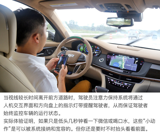 ????????原則上駕駛員應(yīng)該緊盯前方,時刻準備著接管汽車的控制權(quán)。但實際上基于ACC自適應(yīng)巡航系統(tǒng)的Super Cruise?超級巡航為行駛中的汽車提供了充足的“安全緩沖余量”。在底特律郊區(qū)高速公路上實際體驗證明,視線短暫的離開正前方(大約3-5秒之內(nèi))處于系統(tǒng)安全的“可接受”范圍內(nèi),比如喝水、吃東西或者調(diào)節(jié)空調(diào)多媒體娛樂系統(tǒng),這些操作都沒什么問題。