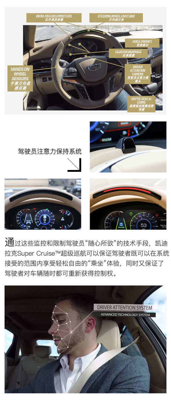 ????????但問題是,當一臺車自己好好的行駛在高速公路上,人性驅(qū)使下的駕駛員很容易把注意力轉(zhuǎn)移到其它地方,這就造成了極大的安全隱患。所以凱迪拉克Super Cruise?超級巡航系統(tǒng)最與眾不同的地方,也是讓我覺得最有價推廣價值的設(shè)計理念,是通過駕駛員注意力保持系統(tǒng)與高精度地圖數(shù)據(jù)緊密結(jié)合?,主動監(jiān)測駕駛員的狀態(tài)并做出及時回應(yīng)。這套系統(tǒng)能督促駕駛者始終保持對車輛運行狀態(tài)的有效監(jiān)控,這給其釋放雙手的駕駛輔助功能帶來更安全、更自信的使用體驗。