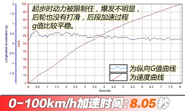 ????雖然可以關閉穩(wěn)定系統(tǒng),但感覺卻對發(fā)動機輸出非常保守,變速箱也不允許拉到很高的轉速。起步后車輪沒有明顯滑動,說明并沒有達到最佳輸出狀態(tài),最終成績?yōu)?.05秒,成績與老款車型有差距,略有遺憾。