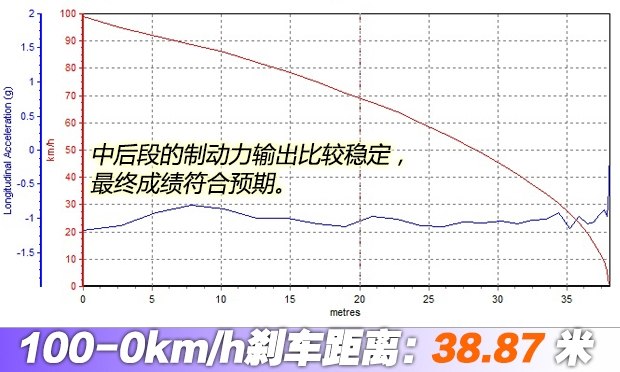 ????全力制動時車身有點頭的現(xiàn)象,但車身總體保持穩(wěn)定,最終成績?yōu)?8.87米,表現(xiàn)符合預期。這個成績在汽車之家的評價體系中,也屬于優(yōu)秀水平。