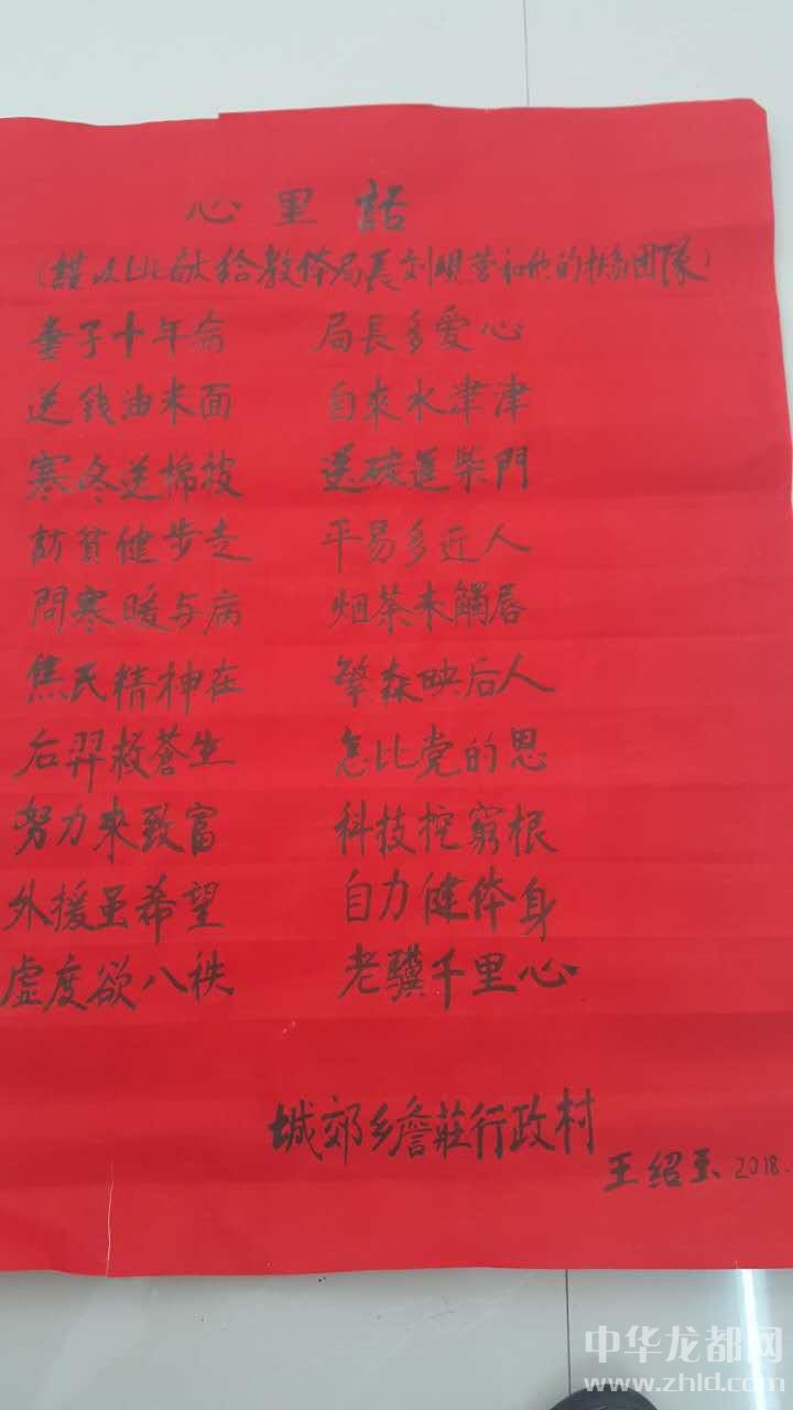 “我推敲了幾個(gè)半夜,寫(xiě)了《心里話(huà)——謹(jǐn)以此獻(xiàn)給教體局局長(zhǎng)劉現(xiàn)營(yíng)和他的扶貧團(tuán)隊(duì)》這首五言排律,表表我和老伴及全村對(duì)您的感激之情。”“妻子十年病,局長(zhǎng)多愛(ài)心。送錢(qián)米油面,自來(lái)水津津。寒冬送棉被,送炭至柴門(mén)。訪貧健步走,平易又近人。”王紹玉聲情并茂地朗讀著,劉局長(zhǎng)爽朗地笑了,“老伴劉桂蘭藥按時(shí)吃了嗎?”“按時(shí)吃了,多虧您,到我家宣講扶貧政策,幫助我聯(lián)系有關(guān)單位,我老伴享受了慢性病醫(yī)保?!薄肮鹛m說(shuō),人家劉局長(zhǎng)隔三差五給咱送米面油,逢年過(guò)節(jié)給咱送慰問(wèn)金,前幾天頂風(fēng)冒雪送來(lái)兩床被子,一年不知來(lái)了多少趟,待咱比親人還親啊!我家也沒(méi)有什么拿出手的,我倆一合計(jì),就發(fā)揮我的一點(diǎn)專(zhuān)長(zhǎng),給您寫(xiě)了首詩(shī),您經(jīng)常去我家噓寒問(wèn)暖,我今個(gè)也來(lái)您這,算是走走親戚吧,回報(bào)回報(bào)您!”