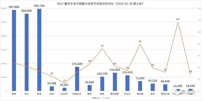 銷售的數(shù)量固然重要,但是銷售質(zhì)量也是評估銷售力不能忽視的重要指標(biāo)。衡量銷售質(zhì)量,“加權(quán)平均成交價(jià)”和“單車?yán)麧櫋边@兩個(gè)重要參數(shù),也許讓我們更直觀的看到車企的銷售能力與經(jīng)銷商單店經(jīng)營質(zhì)量。這些更微觀的數(shù)據(jù)往往更能反映銷售公司及其經(jīng)銷商體系的銷售能力及水平。“加權(quán)平均成交價(jià)”反映車企的產(chǎn)品力與銷售公司的銷售能力,車企賣掉的車越多,單車價(jià)格越貴,品牌就越具有競爭力,反之就需要考慮改進(jìn)產(chǎn)品,提升銷售管理能力?!皢诬?yán)麧櫋敝附?jīng)銷商銷售新車獲取的利潤,不含衍生利潤,一般在-4%-7%之間,如果單車?yán)麧櫝^-2%,廠家需要考慮對經(jīng)銷商進(jìn)行補(bǔ)貼,如果利潤超過7%,車企就會(huì)調(diào)整經(jīng)銷商浮動(dòng)返利。下面我們通過這兩個(gè)指標(biāo),來看哪些豪華車品牌在2017年表現(xiàn)更具實(shí)力。