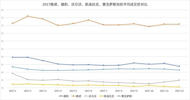 凱迪拉克、捷豹路虎、雷克薩斯、沃爾沃四個(gè)品牌銷量在10萬輛以上為第二陣營。除路虎外,捷豹因進(jìn)口F-pace帶動(dòng)其成交價(jià)上揚(yáng),隨著XE國產(chǎn)上市銷售,捷豹銷量有望進(jìn)一步增長,價(jià)格進(jìn)一步下探;以銷售進(jìn)口車型為主的雷克薩斯,今年銷量質(zhì)量不錯(cuò),庫存時(shí)間短,資金周轉(zhuǎn)快,多數(shù)以訂單方式銷售,加權(quán)平均價(jià)在42萬上下,成交價(jià)格走勢平穩(wěn),經(jīng)銷商今年利潤也很豐厚。沃爾沃在新款車型的帶動(dòng)下,成交價(jià)格開始上揚(yáng);凱迪拉克今年銷量增速較快,通過下圖我們可以看到,凱迪拉克基本依靠低價(jià)獲取銷量的增長,成交價(jià)格進(jìn)一步走低,經(jīng)銷商的利潤需要依靠廠家補(bǔ)貼。