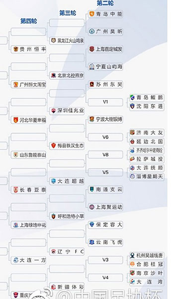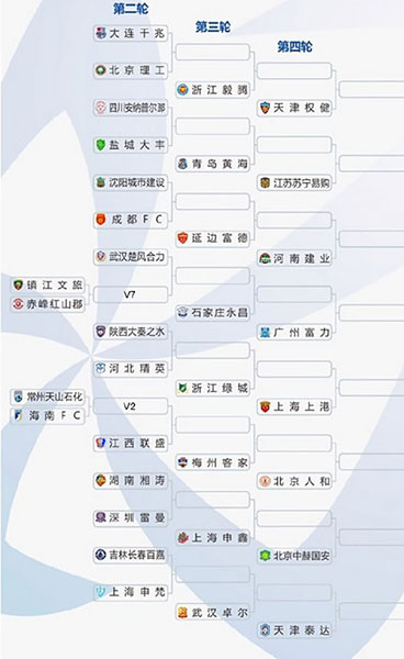 第四輪開始16支中超球隊(duì)加入角逐,加上從第三輪晉級的16支球隊(duì),共32支球隊(duì)參賽,中超球隊(duì)自動落位相應(yīng)客場簽位,其中廣州恒大、上海申花、上海上港和天津權(quán)健4支亞冠球隊(duì)將分別落位在A、B、C、D區(qū),這4支球隊(duì)在半決賽之前不會相遇。
