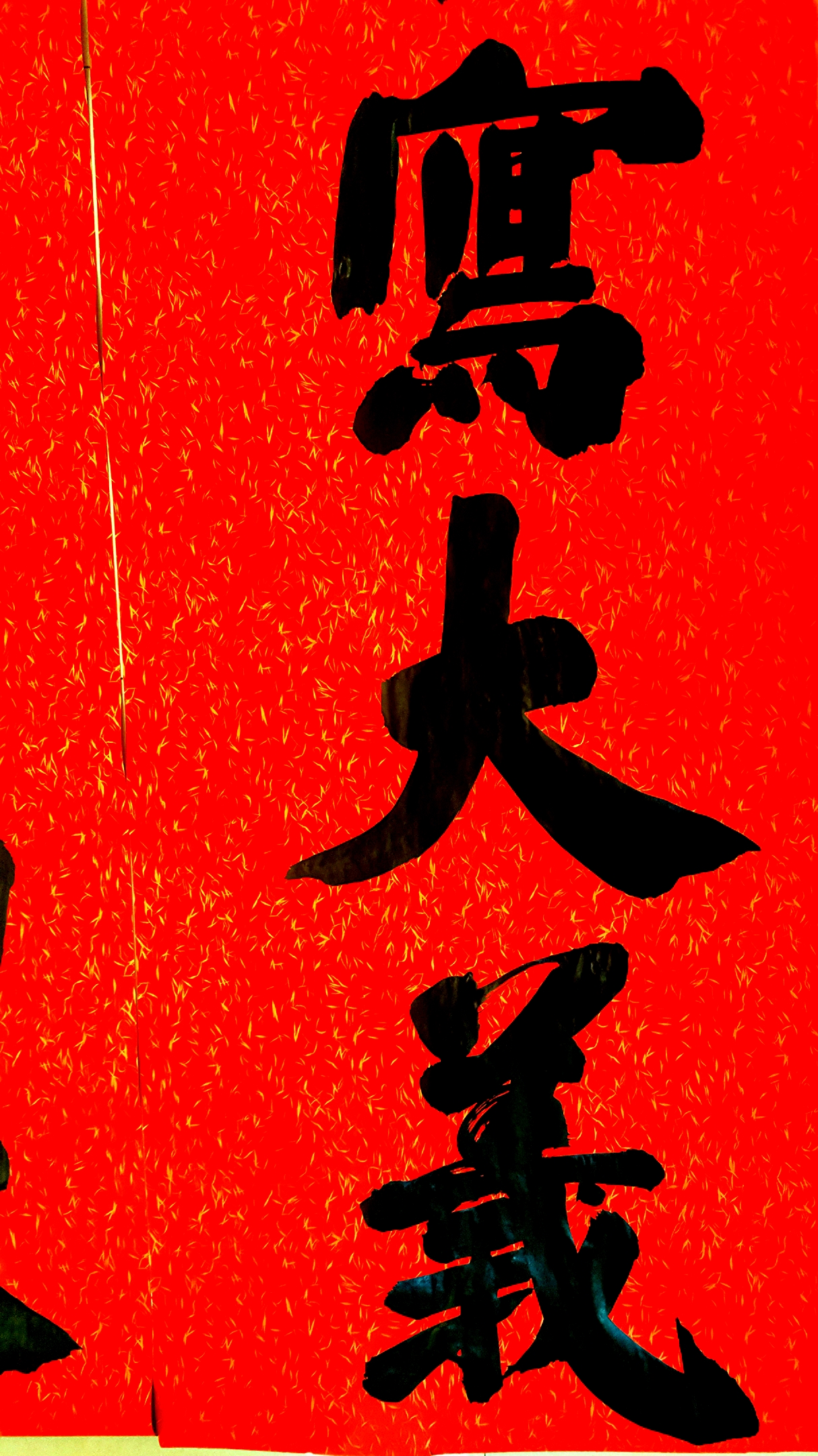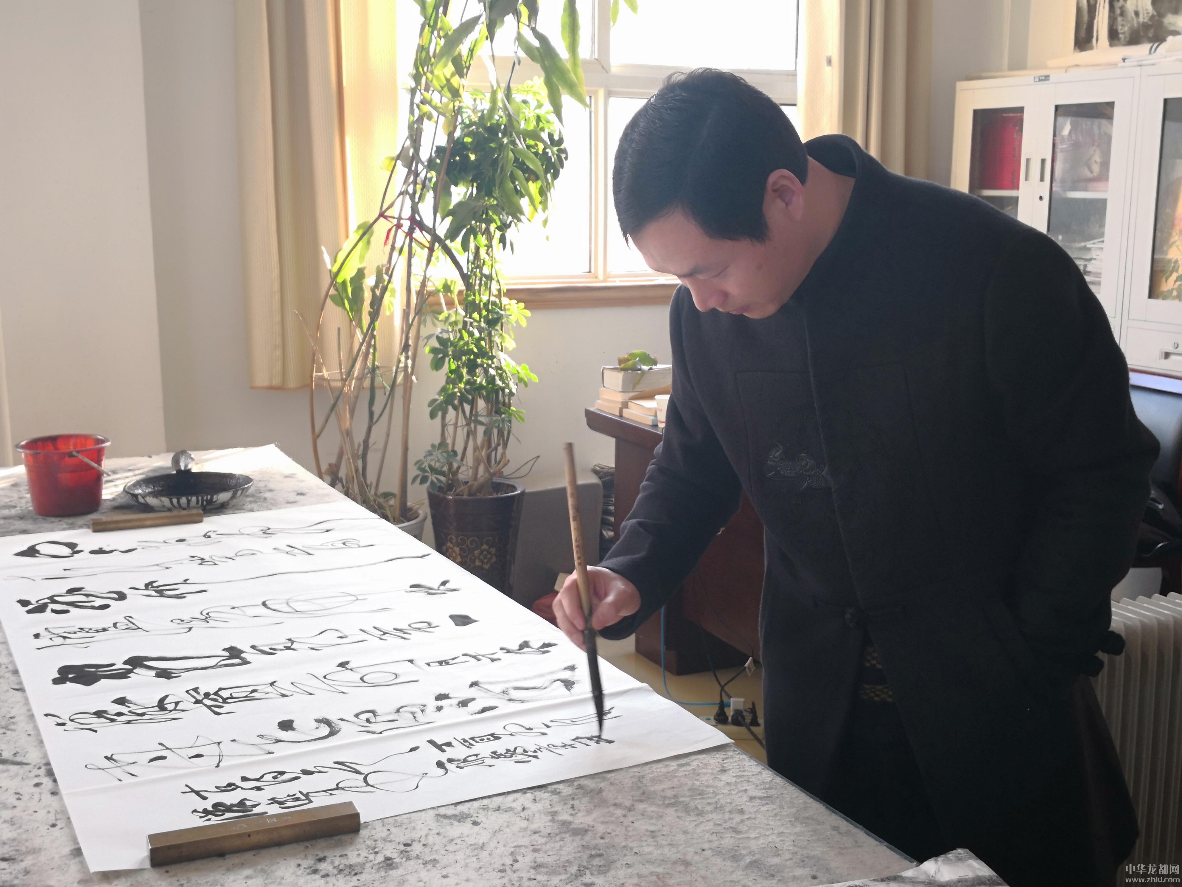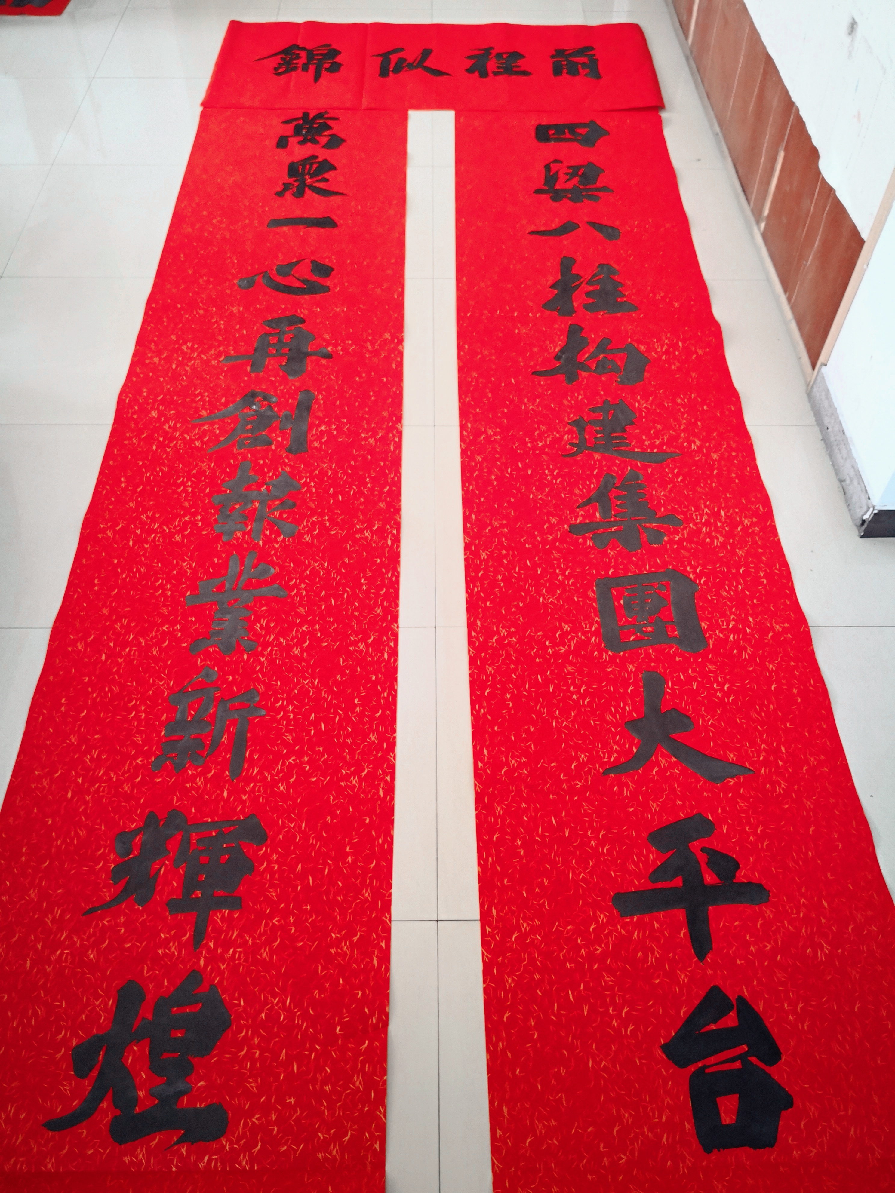 邢懷章以歐陽通筆法融合魏碑,大楷榜書創(chuàng)作而成,春聯(lián)長達5米,每字徑80公分左右,一氣呵成,不計工拙,近兩個小時完成兩幅巨型春聯(lián),表達了對周口報業(yè)集團的祝福,映出了喜慶的年味。