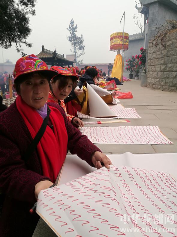 大霧的確延緩了香客的腳步,這也讓晚來(lái)的記者得以看到祭拜的盛景。女媧陵前,十幾名身著統(tǒng)一緞面紅襖,穿黑棉布鞋的女客正在結(jié)伴焚香祭拜,口音明顯和當(dāng)?shù)厝瞬煌?。她們是從距西華300多公里的濮陽(yáng)范縣、臺(tái)前縣來(lái)的,說(shuō)是凌晨2時(shí)就起身出發(fā),大霧中不僅遭遇堵車,還迷了路,到女媧城都快8時(shí)了。她們這次一起來(lái)的有30多人,分乘4輛車。就像往常前來(lái)一樣,她們?cè)谂畫z城要焚香、跪拜、“寫賬”(在紙上畫符,敬奉女媧的一種民間形式)、“守功”(在大殿靜坐,以示對(duì)女媧親近),直至下午方回?!拔覀兠磕炅鲁跻缓团D月初一都來(lái),為啥?信奉女媧娘娘唄,不來(lái)不舒服。”其中一位孔姓香客告訴記者。