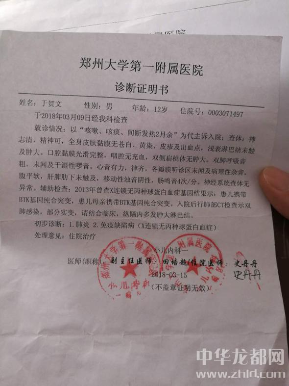 “肺炎、免疫缺陷?。╔連鎖無丙種球蛋白血癥)”,2018年3月15日,來自鄭大一附院的一張化驗單讓于東兩口子徹底崩潰了。于東說,拉拉扯扯求醫(yī)四五年,有時候檢測結果證明是孩子先天性免疫力低下,疑似造血功能不完善,但他不敢相信。由于家庭貧困,他們四處借債在縣、鄉(xiāng)、村三級醫(yī)院救治。