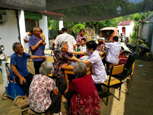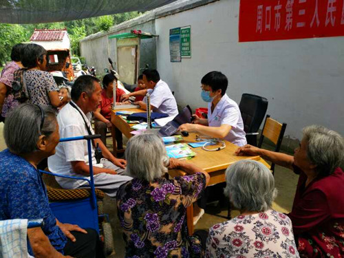 8時(shí)40分許,醫(yī)護(hù)人員在文莊社區(qū)衛(wèi)生室的醫(yī)務(wù)人員的協(xié)助下搭起了臨時(shí)義診臺,為村民測血糖、量血壓,并針對測量結(jié)果給出用藥指導(dǎo),為村民提供健康咨詢服務(wù),現(xiàn)場解答健康問題,并根據(jù)部分村民身體狀況提出合理的防治建議。