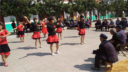 活動現(xiàn)場,隨著婉轉(zhuǎn)悠揚的歌曲響起,統(tǒng)一服裝的舞蹈隊阿姨們翩翩起舞,老人們都搬著小板凳圍坐成一圈,氣氛一片祥和。