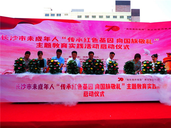 嘉賓們共同澆灌希望之花,啟動長沙市未成年人“傳承紅色基因 向國旗敬禮”主題教育實踐活動。