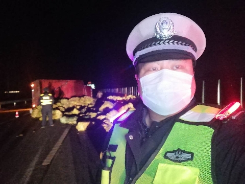 2月15日晚,一輛滿載著蔬菜的大貨車在大廣高速周口轄區(qū)內(nèi)側(cè)翻,一車娃娃菜傾倒在高速路上,占據(jù)了兩個車道,急需救援。市公安局交通管理支隊高速二大隊民警接警后迅速救援,幫助運送保障物資的司機(jī)先去送貨,再回來處理事故。