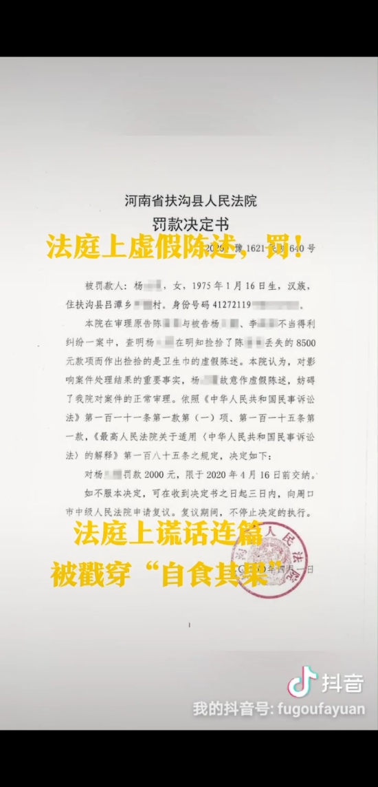 為了將撿到的8500元錢據(jù)為己有,當(dāng)事人竟然在法庭上作出虛假陳述,最終不僅被法官當(dāng)庭識破,全額返還失主,還被法院處以2000元罰款,真可謂得不償失、自食苦果。近日,針對被告楊某的虛假陳述行為,扶溝縣人民法院呂潭法庭依法作出罰款2000元的處罰決定,楊某在規(guī)定時間內(nèi)繳清了罰款。