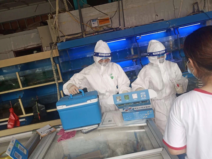 當(dāng)日,分別對6月14日排查中發(fā)現(xiàn)的一箱三文魚、銷售三文魚的電子秤、分割案板等相關(guān)器具進(jìn)行了核酸檢測,隨后又對周邊經(jīng)營進(jìn)口凍品的人員及相關(guān)產(chǎn)品也進(jìn)行抽樣檢測。抽樣完畢后,市場監(jiān)管分局執(zhí)法人員繼續(xù)對市場內(nèi)的水產(chǎn)品批發(fā)經(jīng)營區(qū)進(jìn)行檢查,查看商戶的相關(guān)資質(zhì)和經(jīng)營環(huán)境,檢查了海鮮類產(chǎn)品的進(jìn)貨渠道及相關(guān)檢疫證明等,共計(jì)檢查海鮮商戶5戶、凍品商戶7戶、水產(chǎn)區(qū)商戶8戶,未發(fā)現(xiàn)由北京新發(fā)地市場進(jìn)口的三文魚類海鮮產(chǎn)品及國外重點(diǎn)疫區(qū)進(jìn)出口水產(chǎn)品。