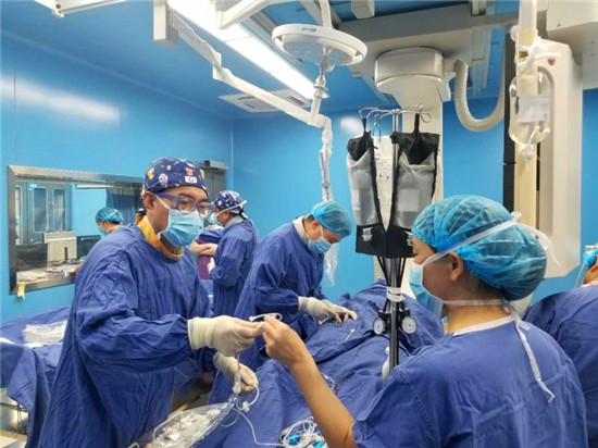 患者任某某,肝硬化門靜脈高壓癥的患者突發(fā)急性消化道大出血,呈失血性休克狀態(tài),病情危急多學(xué)科緊急會(huì)診后,經(jīng)討論消化道出血是危機(jī)患者生命,先介入栓塞止血。急診被送到淮陽區(qū)人民醫(yī)院放射介入治療中心。家屬同意簽字,緊急行經(jīng)頸靜脈肝內(nèi)門體靜脈分流術(shù)(TIPS)。經(jīng)過近一個(gè)小時(shí)的緊張手術(shù)過程;經(jīng)由頸內(nèi)靜脈入路,采用特殊穿刺裝備、球囊導(dǎo)管及血管內(nèi)支架,栓塞迂曲擴(kuò)張的食管,胃底靜脈,在較粗的肝靜脈和肝內(nèi)門靜脈之間建立一個(gè)有效的分流道,使部分門靜脈血流直接匯入體循環(huán),從而達(dá)到止血及降低門靜脈壓力。術(shù)后患者出血停止,血壓明顯回升生命體征逐漸平穩(wěn)。