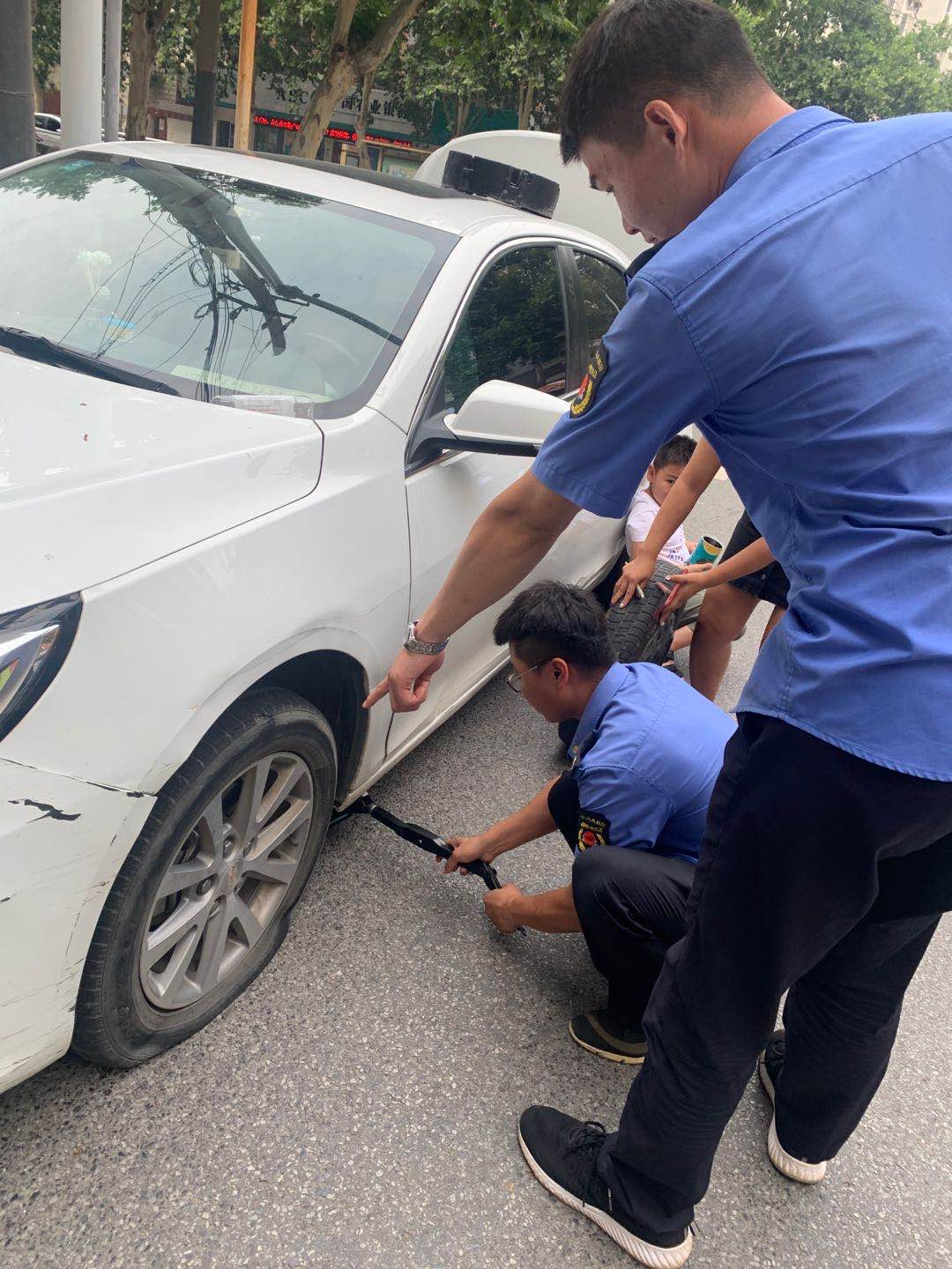 當時,城管隊員上前查看發(fā)現(xiàn),車輛左前輪爆胎,一位女車主正在車邊焦急地徘徊,車內(nèi)還有一兒童,因天氣炎熱,焦躁不安。