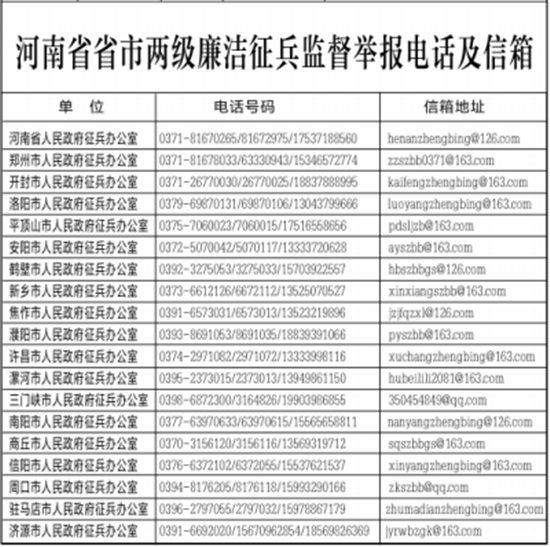 為扎實做好河南省廉潔征兵工作,切實維護廣大應(yīng)征青年合法權(quán)益,確保為國防和軍隊建設(shè)輸送優(yōu)質(zhì)兵員,現(xiàn)將省本級廉潔征兵監(jiān)督員和省市兩級廉潔征兵監(jiān)督舉報方式予以公示,歡迎社會各界對征兵工作予以監(jiān)督。征兵工作政策法規(guī)請關(guān)注“河南征兵”微信公眾號。