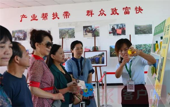 在光山縣槐店鄉(xiāng)司馬光油茶園的河南聯(lián)興油茶公司的展廳內,講解員正在給游客介紹油茶產品。劉宏冰 攝