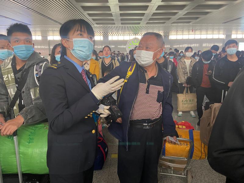 今年30多歲的王琪就是其中一名客運值班員。她家在濮陽市,今年6月份從高鐵許昌北站調(diào)到高鐵周口東站工作,她的主要工作是在旅客進(jìn)入候車廳后,引導(dǎo)旅客有序排隊進(jìn)入站臺,調(diào)配崗位人員,遇到旅客救助等突發(fā)狀況,及時處置。