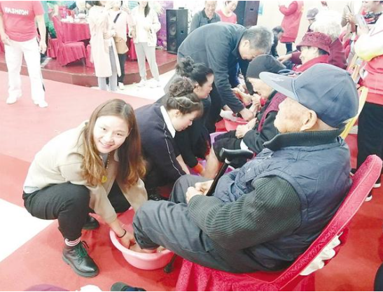 重陽節(jié)當天,周口市總工會、周口市教體局、川匯區(qū)供銷社在鴻運酒店舉辦“九九重陽節(jié) 濃濃敬老情”孝老愛親活動,邀請200多名社區(qū)老年人及家屬參加?;顒蝇F場,家屬為老人進行了洗腳(如圖),主辦方安排了精彩的文藝演出,博得觀眾陣陣掌聲,讓社區(qū)老人過了一個歡樂祥和的重陽節(jié)。