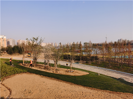 11月11日,在中心城區(qū)沙潁河北岸周口大道至八一大道段生態(tài)改造工程EPC項(xiàng)目施工現(xiàn)場(chǎng),施工人員正在進(jìn)行地被植物的種植、綠化樹(shù)木的養(yǎng)護(hù)。