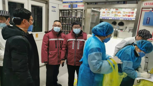 為助力第一屆周商大會圓滿成功,市衛(wèi)生健康委抽調(diào)近百名調(diào)精兵強(qiáng)將組成衛(wèi)生保障專班開展衛(wèi)勤保障工作。圖為工作人員在市委黨校迎賓館和體育賓館餐廳對后廚人員做核酸檢測及開展冷鏈?zhǔn)称废尽?/span>