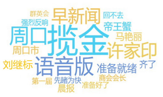 網(wǎng)絡(luò)熱詞反映了網(wǎng)民關(guān)注的重點(diǎn),詞云圖中大大的“攬金”二字占據(jù)詞云圖中央,可見(jiàn)攬金是真的攬金,據(jù)悉,首屆周商大會(huì)簽約項(xiàng)目31個(gè),總投資達(dá)429.7億元人民幣?!霸S家印”“馬艷麗”在整個(gè)圖中也是光彩奪目,作為周口人,走上北上廣深的成功人士還心心念念家鄉(xiāng)的發(fā)展,讓老鄉(xiāng)們倍感溫暖,家鄉(xiāng)人關(guān)注他們?yōu)榧亦l(xiāng)發(fā)展做出的努力和他們的動(dòng)態(tài)也是再正常不過(guò)了。