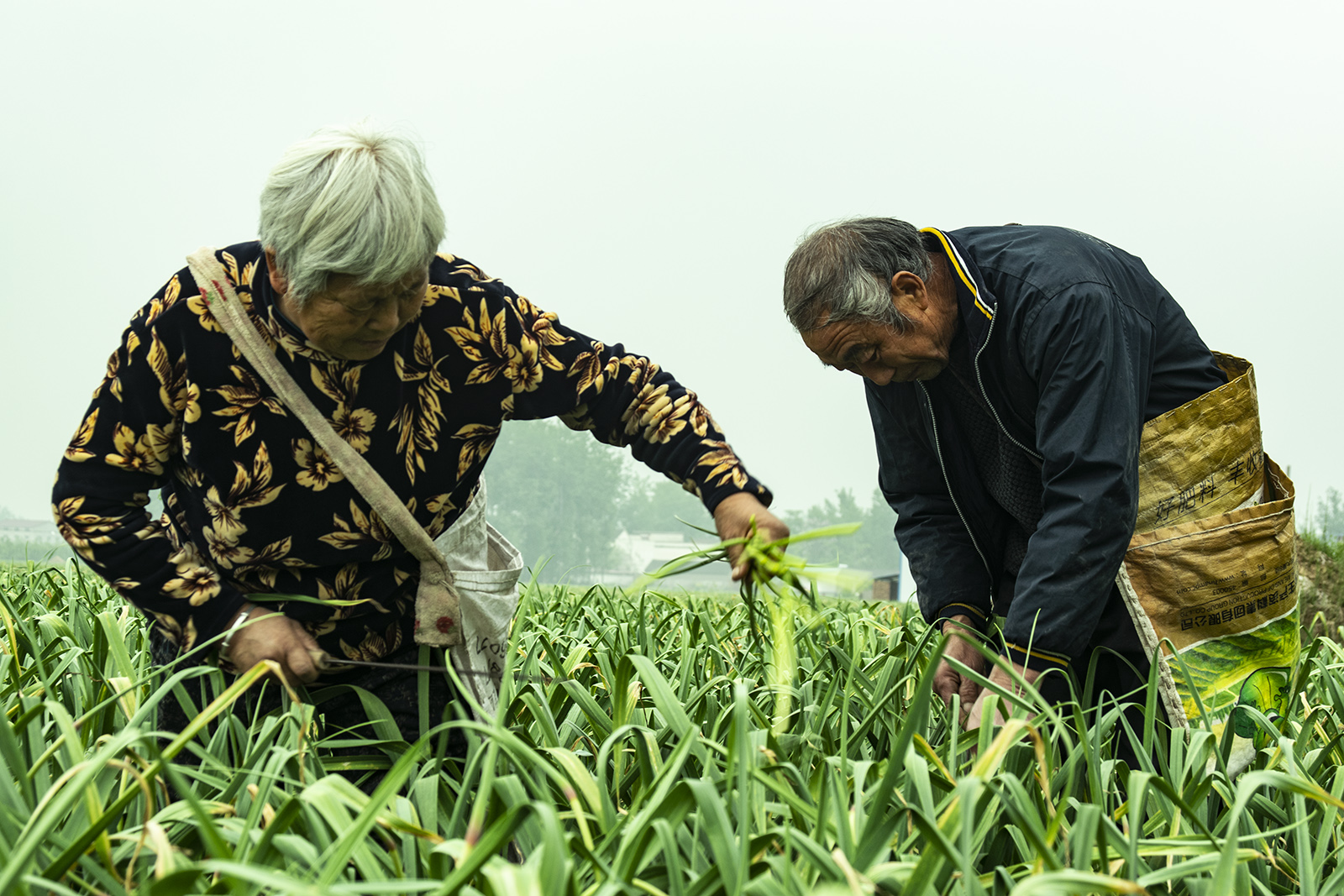 姚路口村一對(duì)老夫婦在自己蒜地里提取晚蒜薹