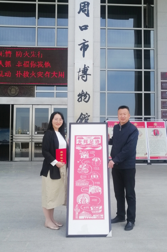 4月28日,河南科技職業(yè)大學(xué)老師范文華來到周口市博物館,將自己的剪紙作品“光輝足跡”捐贈(zèng)給周口市博物館,在建黨100周年之際,表達(dá)一位教育工作者的殷殷之情。周口市博物館館長周建山向其頒發(fā)榮譽(yù)證書。