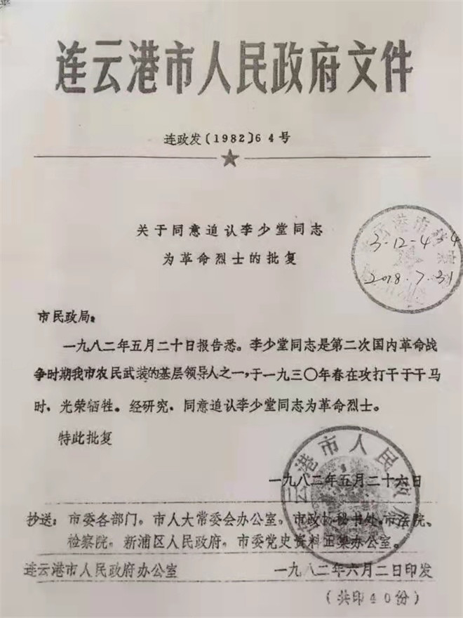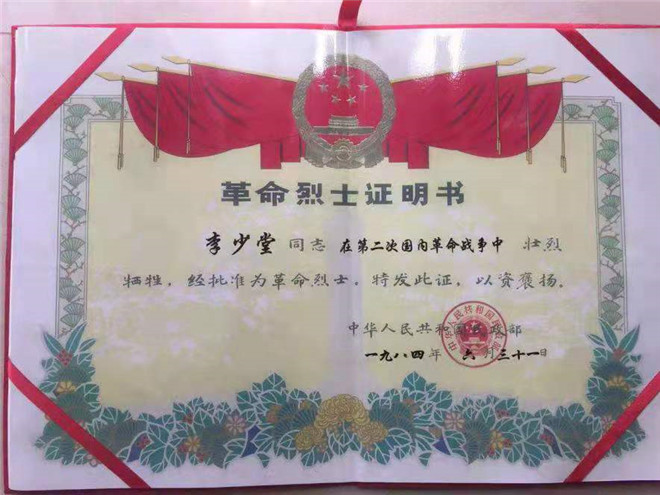 新中國成立后,李少堂的孫子才聯(lián)系上了李少堂曾經(jīng)的革命戰(zhàn)友惠浴宇同志。時任江蘇省省長的惠浴宇同志得知消息后,親寫證明遞交黨中央,這才證實(shí)了李少堂的身份。