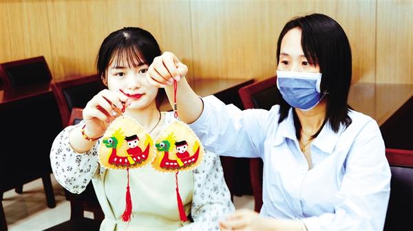 6月20日,市城鄉(xiāng)一體化示范區(qū)工作人員展示做好的香囊。當(dāng)日,市城鄉(xiāng)一體化示范區(qū)開展“聞香過端陽 仲夏戴香囊”文明實踐主題活動,從拼龍舟、縫香囊、畫團(tuán)扇、DIY粽子等一系列活動來沉浸式體驗優(yōu)秀傳統(tǒng)手工藝文化。