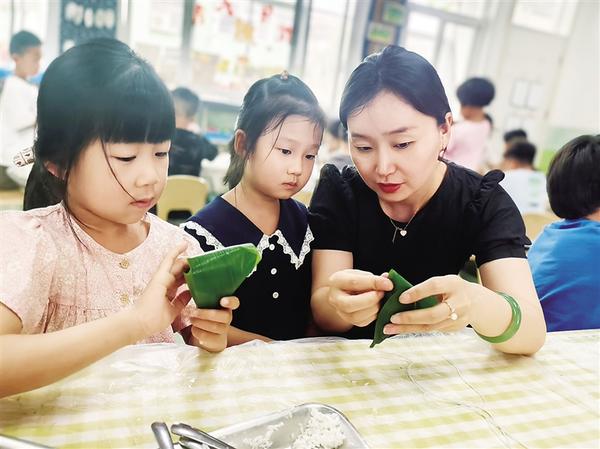 近日,一名幼兒園老師在指導(dǎo)孩子們包粽子。端午節(jié)前夕,周口市市直幼兒園舉辦“迎端午包粽子”活動,旨在培養(yǎng)孩子們的動手能力,激發(fā)勞動熱情,受到孩子們的歡迎。