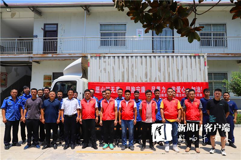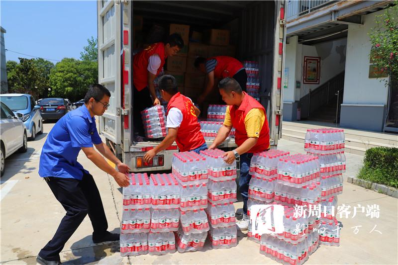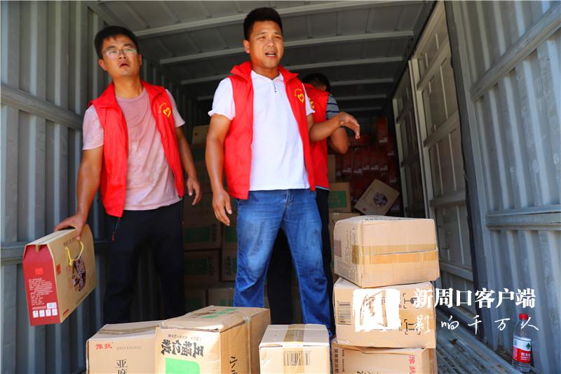 當(dāng)天中午,掛著印有“昨天大家助我脫貧,今天我為救災(zāi)出力!”條幅的防汛救災(zāi)物資運輸車抵達(dá)周口港區(qū)。“要不是前兩天防御臺風(fēng)‘煙花’,我們早就來了?!甭」糯妩h支部書記段長春一下車就連忙慰問眾人。一同前往的還有6位年輕力壯的志愿者,他們不辭勞苦,和港區(qū)消防、城管人員一起頂著烈日,用了半個多小時將滿車物資搬運到位。