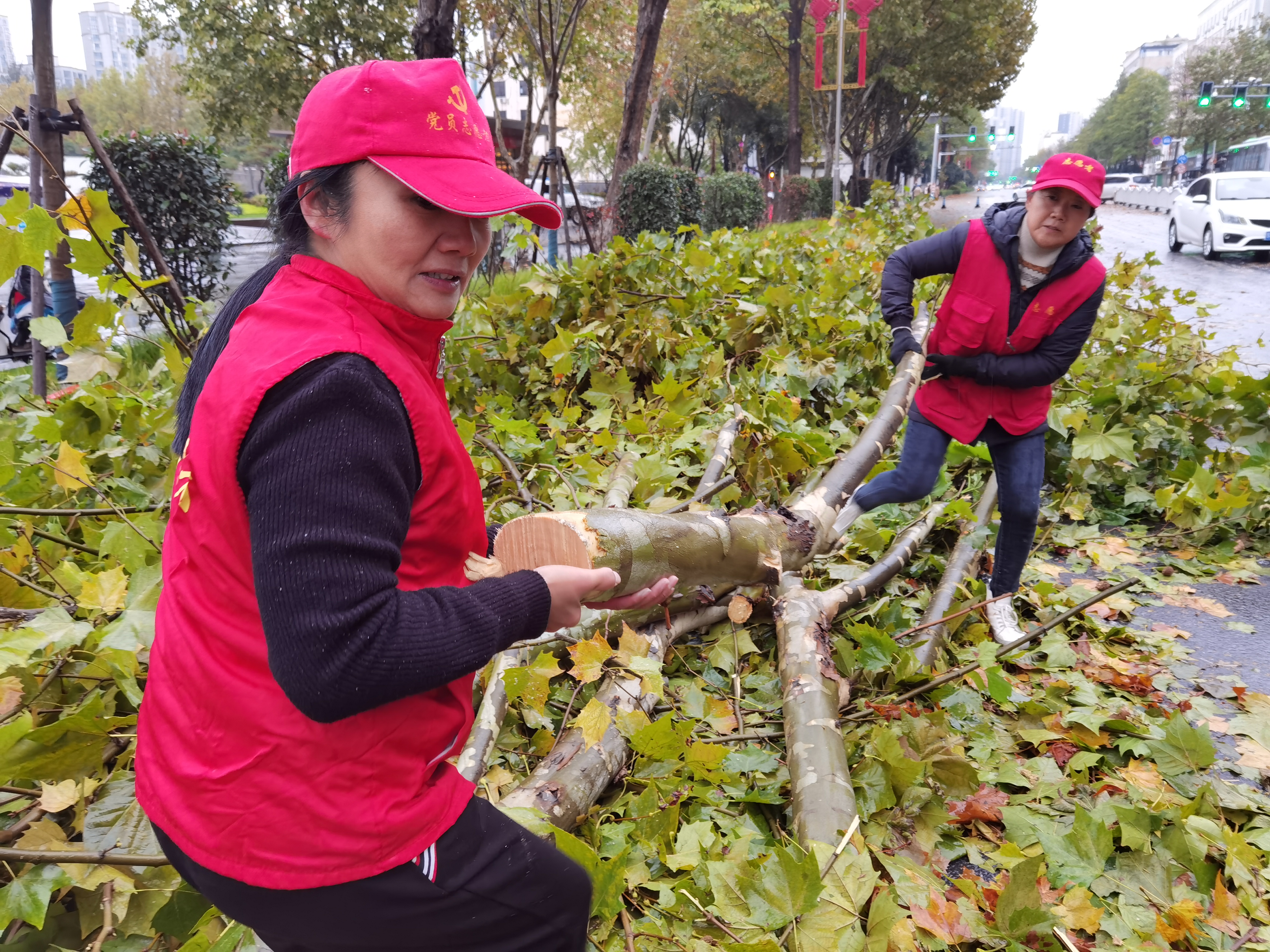 志愿者抬起被鋸斷的樹(shù)枝搬上車