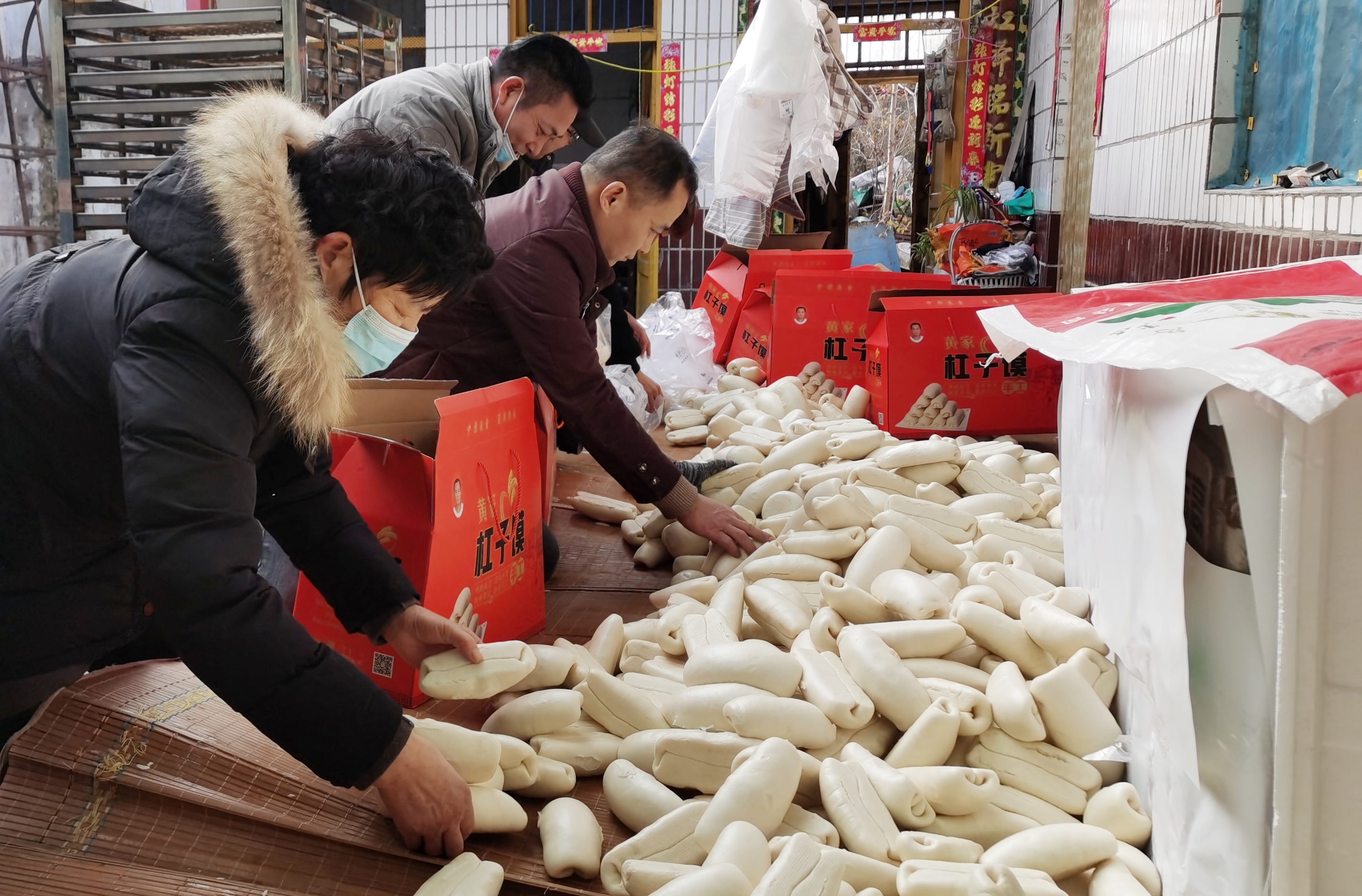 小伙子姓黃,20歲,他的父親不能說話,是殘疾人。趕到過年,店里非常忙碌,全家上陣制作杠子饃,小黃放假了就來店里幫忙。隨著時(shí)代發(fā)展,現(xiàn)在和面、分面劑都有機(jī)器,蒸饃也有蒸箱,一次能出1000多個(gè),少了煙熏火燎,進(jìn)入智能化、高效化的軌道。但杠子饃由于形狀特殊,加之過年期間需求量特別大,所以“做年饃”仍是辛苦活兒,需在頭天晚上將面摻上酵子(方言,即含有酵母的面團(tuán),也叫引酵)和好,放在溫暖處任其發(fā)酵。趕上年關(guān)這樣的旺季,往往需要幾十個(gè)人通宵達(dá)旦地加工,搟劑子、卷造型、二次發(fā)酵,徹夜不息。杠子饃干后不開裂,耐貯存,能放置一個(gè)月以上不變質(zhì),這是傳統(tǒng)工藝與現(xiàn)代技術(shù)相結(jié)合的成果?!爸芸谌诉^年哪兒有不備饃的?你們看我這邊十來個(gè)箱子,每個(gè)箱子要裝50多個(gè)饃,都是要裝好寄到外地的,北京、上海的都有?!毙↑S說。