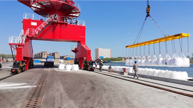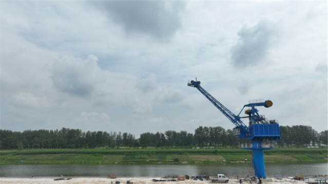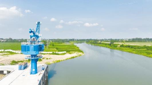 盛夏七月,在項城市東部的項城港,幾架“高聳入云”的新式固定式起重機的主體已安裝完畢,剩余的部件堆放在地上,巨大的框架和鮮紅的涂裝展示著它們的力量。一側,千噸級貨輪正停靠在長長的泊位前,起重機緩緩卸下貨艙內的散貨。