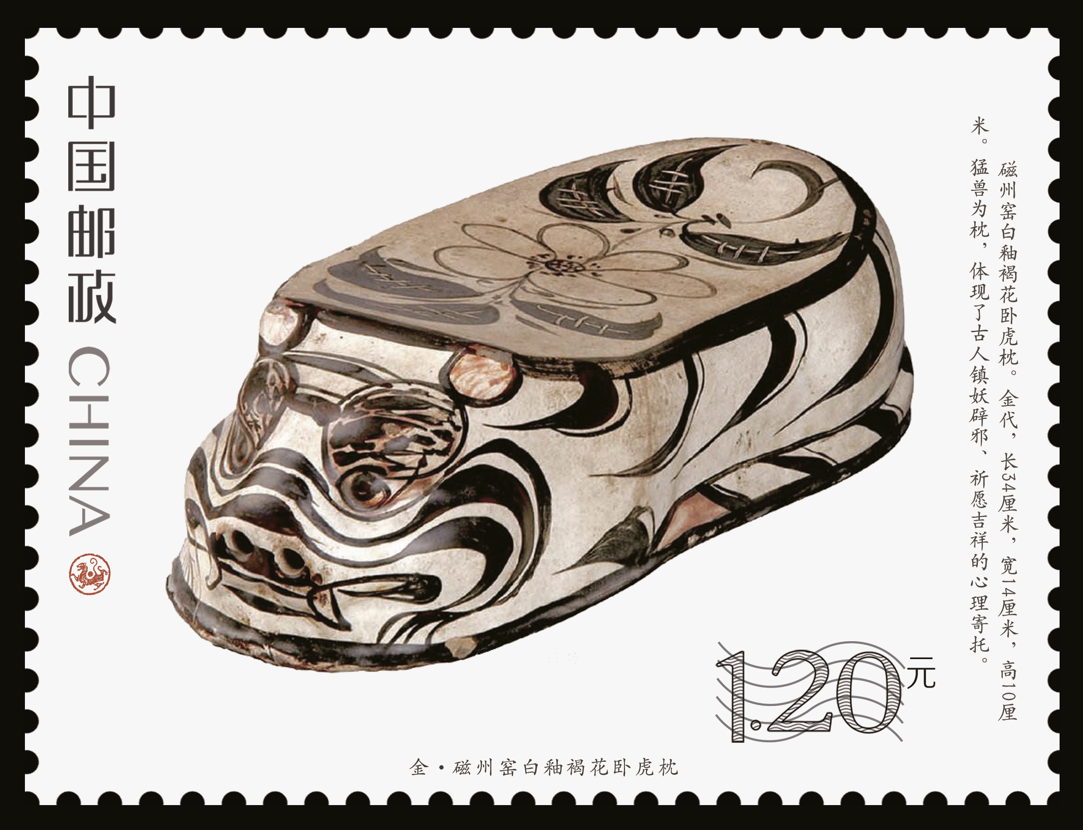 9月5日,由中國(guó)郵政特別制作的《虎文物》特種郵票正式發(fā)行。此套郵票共有6枚,每枚上都印有一件珍貴的虎文物。郵票圖案名稱分別為“商·伏鳥(niǎo)雙尾青銅虎”“春秋·青玉虎形佩”“漢·白虎瓦當(dāng)”“漢·錯(cuò)金銘文銅虎節(jié)”“金·磁州窯白釉褐花臥虎枕”“清·皮影飛虎”。其中第五枚郵票圖案中的“金·磁州窯白釉褐花臥虎枕”就是來(lái)自周口市博物館的珍貴文物。